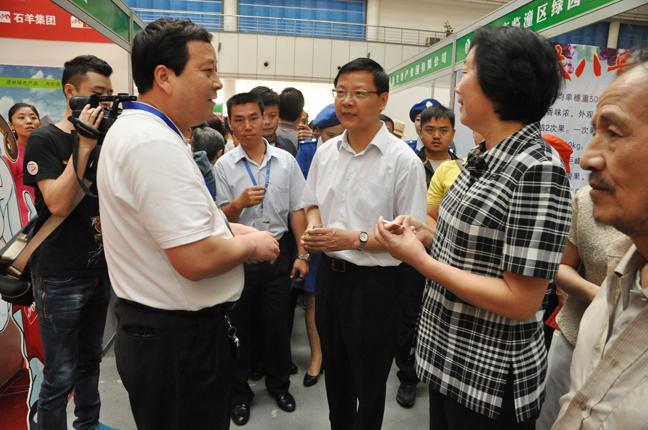 省政協(xié)副主席馮月菊(右一)、陜西省商務(wù)廳廳長姚超英(右二)等領(lǐng)導(dǎo)介紹石羊集團(tuán)參展的產(chǎn)品.